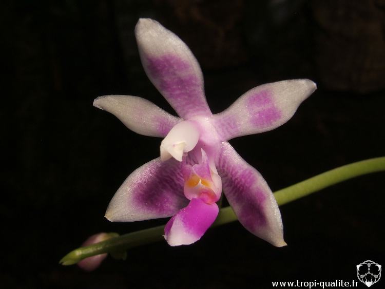 Fleurs : petites (2 à 3 cm), légères, blanches teintées de petites stries ou de points rose/mauve. L'intensité et la taille des taches roses sont très variables suivant l'individu. Les sépales sont plus larges que les pétales latéraux. La colonne est blanche, charnue, cylindrique et légèrement arquée. La plante peut fleurir toute l'année mais fleurit généralement au printemps ou à l'automne. Les fleurs sont très agréablement parfumées (odeur de lilas).