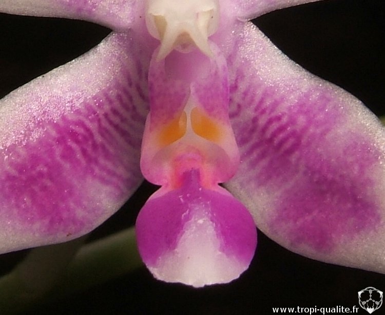 Labelle : trilobé, de couleur générale blanc et rose/mauve. Les lobes latéraux sont érigés, longs et présentent un callus jaune bien visible. Le lobe médian est rose/violet, caréné jusqu'à son milieu, avec un apex blanc présentant rarement une pilosité. Présence d'une paire de callus bifide entre les 3 lobes du labelle. Le callus antérieur est sillonné.