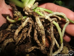 Racines : plus ou moins nombreuses, fines et glabres. L'apex des racines est vert clair.