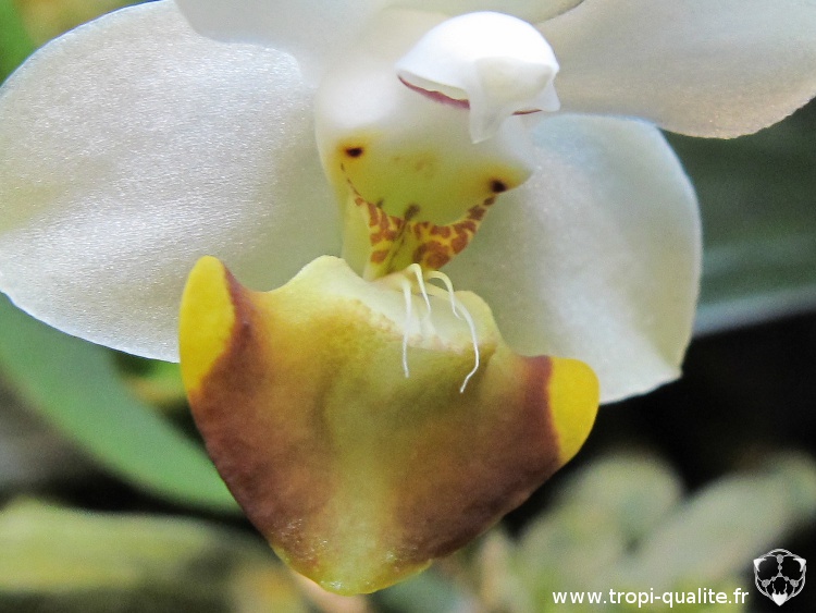 Labelle : trilobé, avec 2 bandes verticales ocre/jaune. Les lobes latéraux sont petits, érigés et présentent une crête. Le lobe médian est mobile (suivez ce lien pour en savoir plus sur les labelles mobiles) et présente une gibbosité denticulée à sa base. Présence d'un appendice plat et divisé en 4 segments filiformes entre les 3 lobes du labelle.