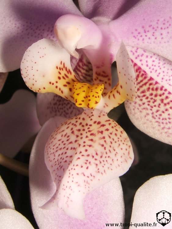 Labelle : trilobé, de couleur générale rose avec des taches violettes. Les lobes latéraux sont érigés et plus clairs, légèrement jaunâtres et maculés de rouge à leur base. Le lobe médian est rose et maculé de violet. Il possède 2 cornes au niveau de l'apex, ce qui lui donne une forme d'ancre à son extrémité. Présence d'un callus très visible entre les 3 lobes du labelle, jaune avec des taches rouges (visible sur la photo ci-dessous).