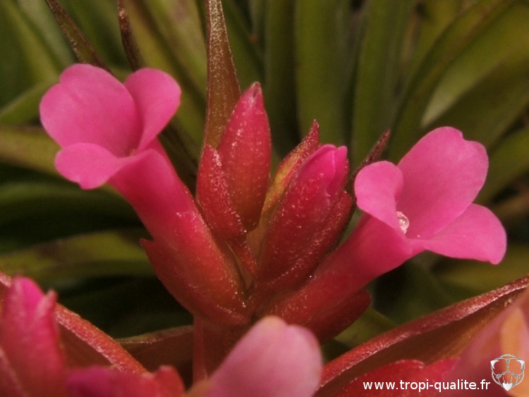 Fleurs : presque sessiles, non tubulaires, longues de 1 à 2 cm, de couleur rose très soutenu. Les étamines et le pistil sont inclus. Absence d'odeurs.