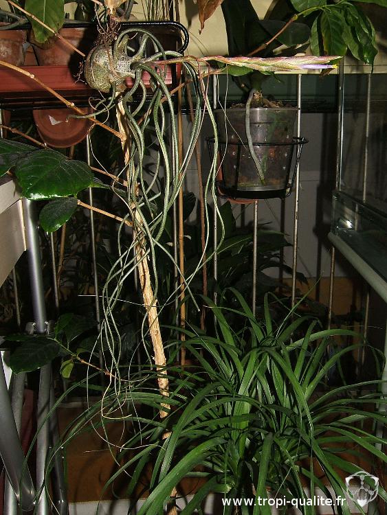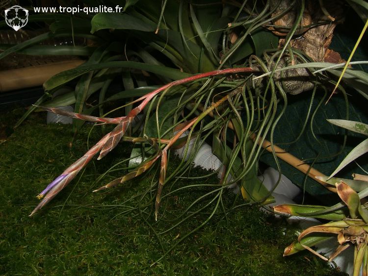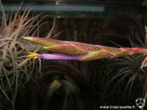 Voilà une espèce originale par sa forme. Elle est de croissance assez lente mais surprend toujours par son allure un peu extraterrestre. Les fleurs sont quant à elles classiques pour un Tillandsia, tubulaires et violettes, apparaissant sur un épi légèrement écailleux, peu ou pas ramifié. Voici les photos :
