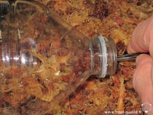 Introduisez votre sphaigne vivante dans la bouteille plastique. Attention à ne pas l'abimer, car la sphaigne est une mousse extrêmement fragile qui casse facilement si on la manipule un peu trop brutalement :