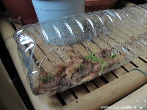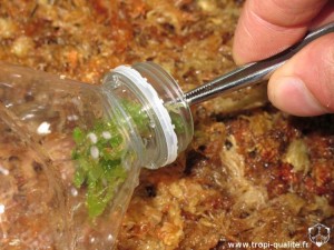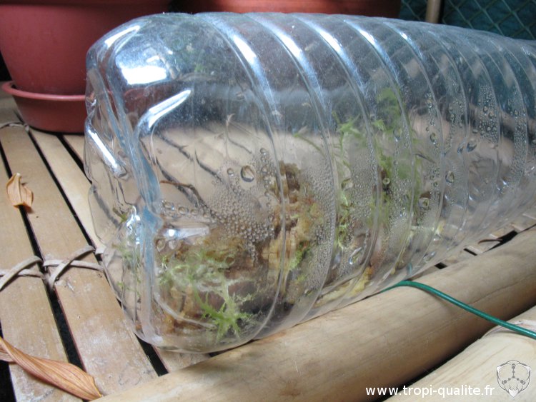 Voici une alternative moins esthétique mais réputée efficace pour cultiver cette plante. Il suffit de glisser un peu de sphaigne morte et imbibée d'eau déminéralisée dans une bouteille en plastique :