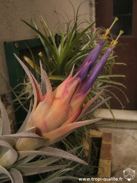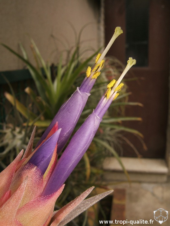 Voici un plante reçue en cadeau d'anniversaire il y a 3 ans. Elle a bien grandi depuis et m'offre enfin sa première floraison, et de belle taille en plus. Je trouve la disposition et la couleur des bractées très intéressantes car elles font un beau dégradé entre la plante et les fleurs, tant au niveau de la forme que des couleurs :
