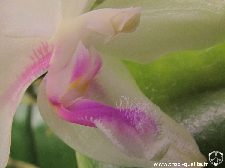 Labelle : court (plus court que les pétales), trilobé. Le lobe médian et l'apex des lobes latéraux sont couleur magenta. les lobes latéraux sont érigés et présentent un callus jaune ainsi qu'un petit renflement en leur milieu. le lobe médian est charnu, avec une bordure dentée ou fimbriée. Il présente au niveau de l'apex un callus couverts de poils blancs qui contraste nettement avec sa couleur magenta. Le lobe médian possède également une carène médiane, peu marquée, mais présentant un aspect dentelé. Au milieu du labelle on distingue 3 organes bifides : 2 entre les lobes latéraux (2 callus superposés) et 1 à la jonction des 2 lobes latéraux et du lobe médian.
