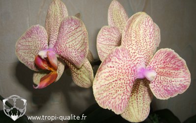 La photo ci-dessus montre une anomalie de forme et de couleur d'un hybride Baldan's Kaleidoscope. La fleur de droite ne possède pas de labelle et ses 2 sépales latéraux ont fusionné en un seul sépale ventral. La fleur de gauche, qui appartient à la même hampe, est normale.
