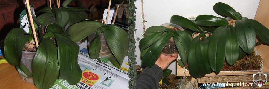 Les photos ci-dessus montrent des Phalaenopsis que l'on m'a ramené un jour, ils n'avaient pas été arrosés depuis plus de 4 mois (photo à gauche) ! Après un rempotage de routine et une fois placés en conditions plus humides sur un plateau avec des billes d'argile (voir le chapitre humidité ambiante pour apprendre à faire cela) ainsi que des arrosages adaptés (pas d'engrais lors des premiers arrosages), les plantes ont "ressuscité" en seulement quelques semaines. Pour preuve, regardez les mêmes plantes un an plus tard (photo de droite). Ca donne de l'espoir non ?