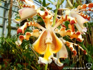 Et, comme d'habitude, une "petite" floraison pour finir, cette fleur est incroyable tant par sa beauté que par sa taille. C'est une des plus belles orchidées qu'il m'ait été donné de voir (et pourtant croyez moi, j'en ai vu et photographié des milliers). Cela dit, elle ne vient pas de mes collections (heureusement, avec sa hampe de 3.5m, j'aurai eu du mal à la faire tenir chez moi :). Voici la belle :