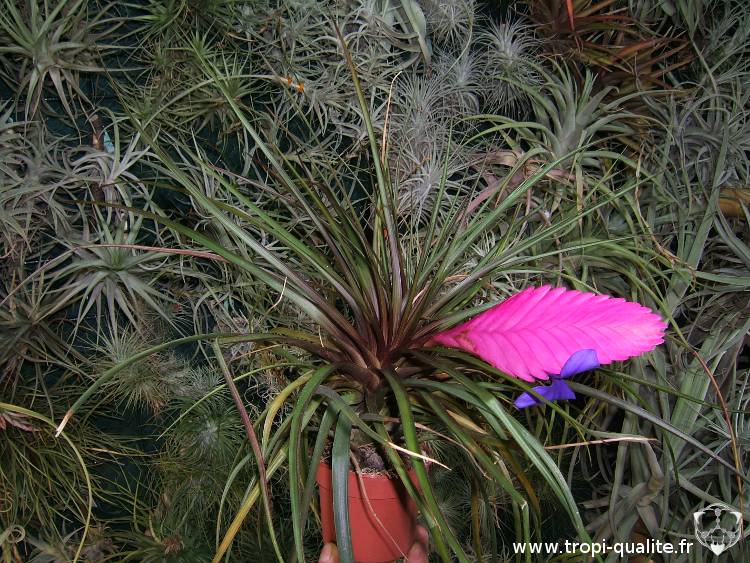 Voilà longtemps que cette plante n'avait pas fleuri et se contentait de développer tranquillement 2 beaux rejets. Il y a quelques mois, l'un d'eux (le plus gros), a entamé la lente croissance d'une inflorescence dont vous pouvez admirer l'une des fleurs aujourd'hui. Bien qu'étant certainement le plus populaire et le plus courant des Tillandsia en intérieur, il n'en reste pas moins un des plus beaux je trouve. Voici les photos de la Belle :