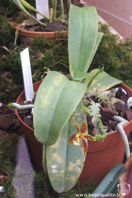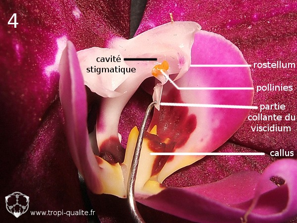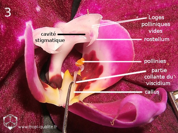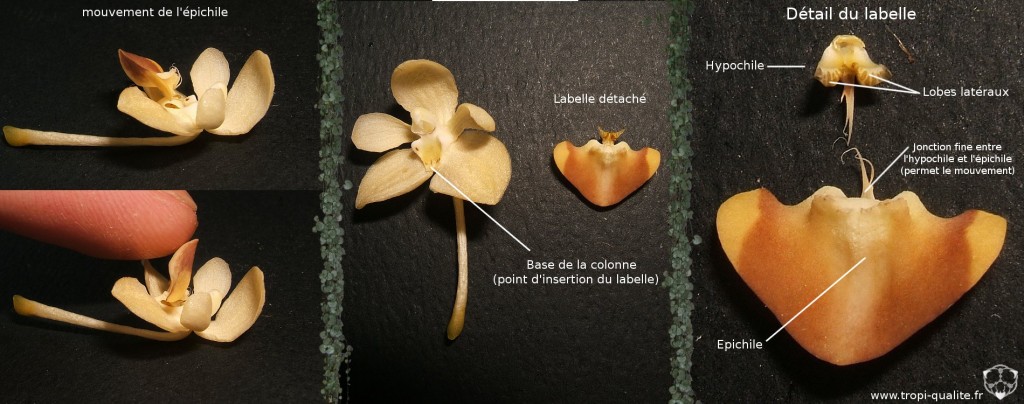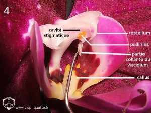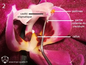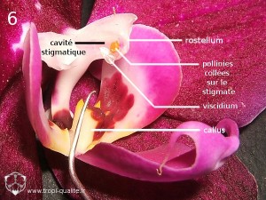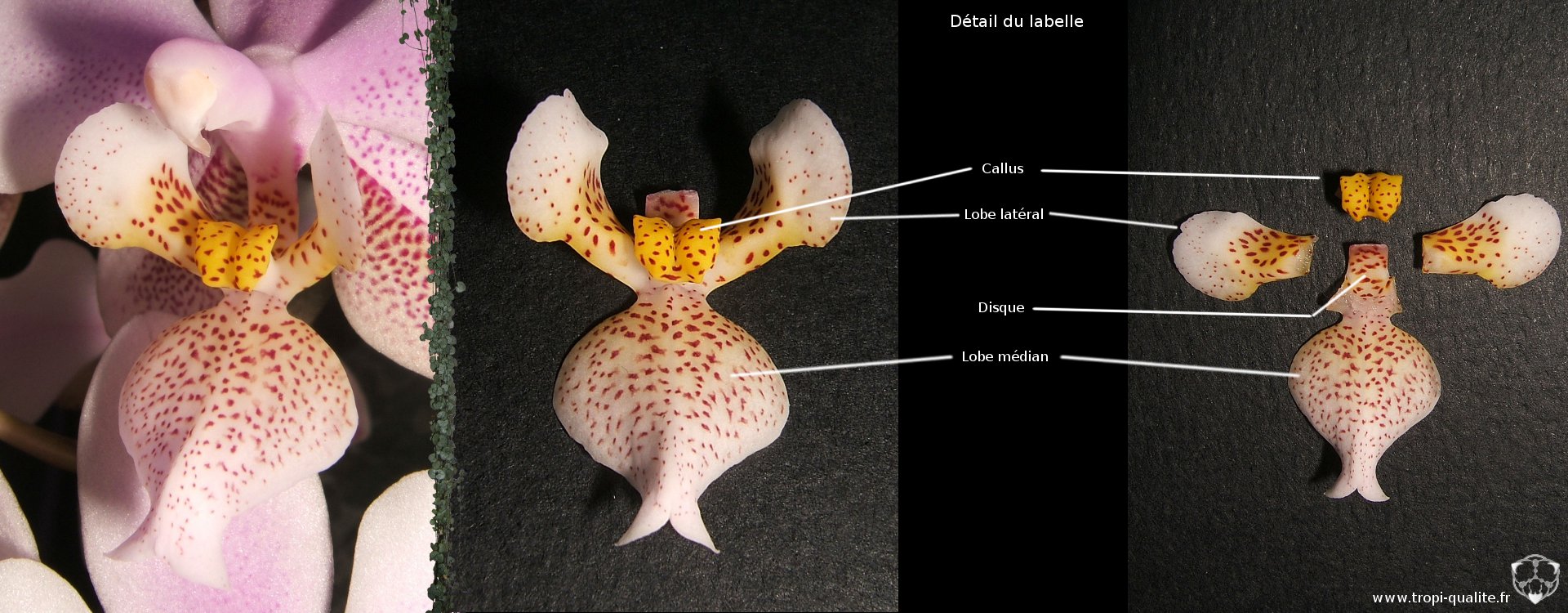 Sur le labelle, on distingue les lobes latéraux et le lobe médian, un ou plusieurs callus (petit renflement servant à caller l'insecte pollinisateur). En haut du labelle se trouve la colonne ou gynostème, organe cylindrique situé au milieu de la fleur et qui renferme les organes sexués :