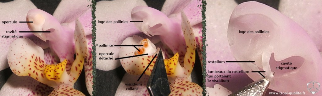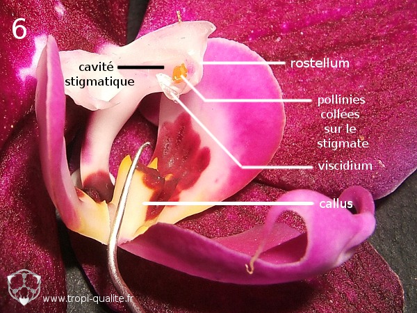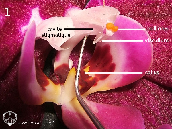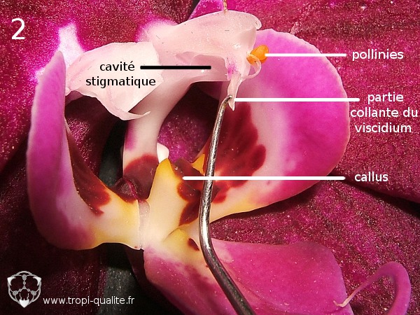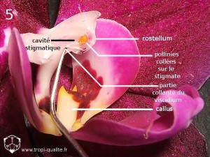 La floraison est spectaculaire et de longue durée chez les Phalaenopsis. Certaines fleurs (les botaniques surtout) sont très odorantes le matin. Toute cette explosion de couleurs et de parfums n'a qu'un seul objectif : attirer un insecte pollinisateur. La morphologie de la fleur prend alors toute son importance. L'insecte, si il est de la bonne espèce, ne peut visiter la fleur sans s'accrocher les pollinies (et donc le pollen) sur le dos. Lorsque l'insecte ira visiter une autre fleur de la même espèce, il la fécondera, en collant les pollinies sur le stigmate, situé dans la colonne. Voici une série de clichés illustrant la fécondation de Phalaenopsis Elegant Deborah. Dans ces photos le rôle de l'insecte est joué par le petit instrument en métal, la colonne (blanche) a été coupée longitudinalement et l'opercule protégeant les pollinies a été retiré :