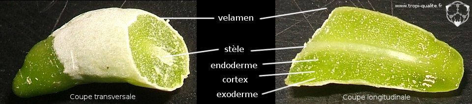 Entre le coeur de la racine qu'on appelle stèle (le "filament" qui subsiste lorsqu'une racine meurt) et le velamen, 3 autres couches de cellules sont distinguables : l'endoderme, le cortex et l'exoderme. Ces couches ont une couleur verte, due à la présence de chlorophylle et sont donc capables d'effectuer la photosynthèse. On le voit d'ailleurs lorsque la racine est humidifiée, l'aspect argenté disparait au profit d'une couleur verte car le velamen, une fois hydraté, permet de voir les tissus chlorophylliens situés en dessous. La stèle ne fait pas la photosynthèse, elle est dépourvue de chlorophylle et est donc de couleur blanche. Elle n'est là que pour assurer le transport de l'eau et des minéraux (sève brute) des racines vers les parties aériennes ou le transport des sucres issus de la photosynthèse (sève élaborée) des feuilles vers les racines.
