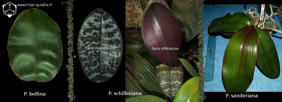 La couleur des feuilles varie généralement du vert clair au vert foncé. Elles sont parfois grisâtres, rougeâtres (comme les nouvelles feuilles de P. sanderiana) ou maculées de petites taches (comme chez P. mannii). Les feuilles dites marbrées, que l'on retrouve presque exclusivement sur les Phalaenopsis botaniques ou les hybrides primaires, sont les plus remarquables. Elles sont d'ailleurs souvent recouvertes de pigments rouges au revers de la feuille, afin de capter un maximum de lumière (voir photo d'une feuille de P. schilleriana ci-dessus).