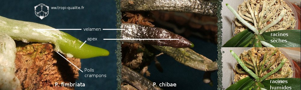 Les racines de Phalaenopsis sont souvent nombreuses, arrondies ou aplaties, souples et glabres (sans poils). Elles sont dites épiphytes (car elles ne poussent pas dans la terre mais souvent sur d'autres plantes) et haptotropes, c'est-à-dire qu'elles poussent en épousant parfaitement le support, ce qui leur permet d'y rester cramponnées solidement. Pour ce faire, lors de la croissance de la racine, l'apex (l'extrémité) va émettre des poils qui vont se lier intimement au substrat, permettant l'adhérence exceptionnelle de la racine. Cet apex va avoir une couleur verte pour la majorité des Phalaenopsis même si certaines espèces comme P. chibae présentent des racines à l'apex rouge violacé.