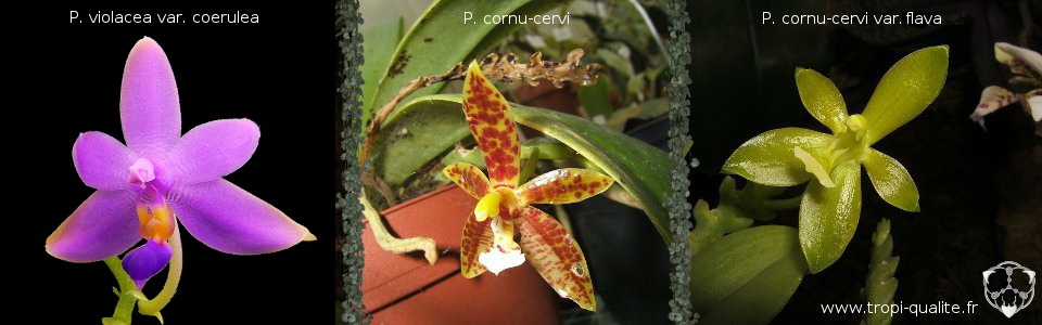 Il est possible de descendre encore plus dans l'arborescence de cette classification avec, par exemple, les sous-espèces (ssp.), les cultivars (cv.) et les variétés (var.). Les noms des variétés sont précédés de var. et les nom des cultivars s'écrivent entre guillemets simples (et sont parfois précédés de cv., pour 'cultivated variety'). La distinction entre les termes variété et cultivar sera traitée dans la page des hybrides, variétés et cultivars. Dans notre exemple ci-dessus, je vous parlais de P. violacea var. coerulea qui est une variété de P. violacea avec un labelle plus "bleuté". Voici d'autres exemples, comme P. cornu-cervi et sa variété P. cornu-cervi var. flava (une variété à fleurs plus grosses et jaunâtres) :