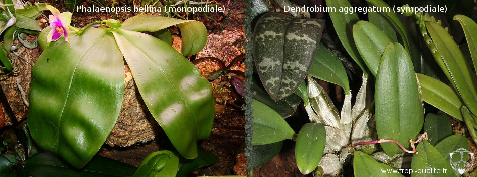 Les Phalaenopsis sont des orchidées dites monopodiales, cela signifie qu'elles ne poussent que sur une seule tige (très courte et cachée chez les Phalaenopsis), avec des feuilles poussant de part et d'autre de celle-ci. La tige grandira pendant toute la vie de la plante. Les orchidées sympodiales quant à elles, on tendance à s'étaler horizontalement le long de rhizomes successifs. Leur tige, formée d'un pseudobulbe à la base et des feuilles au dessus, est "limitée" et ne peut pousser continuellement. Ce sont alors les rejets latéraux qui prendront le relai après la floraison, le pseudobulbe du pied mère servira alors d'organe de réserve avant de finir par dépérir.