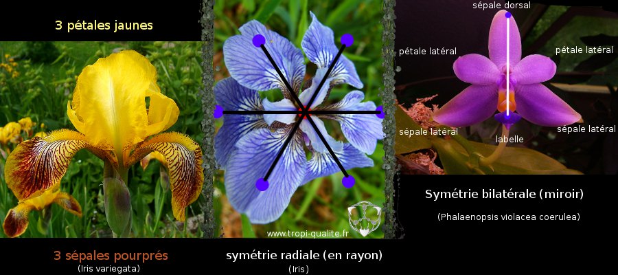 Les fleurs d'orchidées possèdent 3 pétales protégés par 3 sépales. La différence avec d'autres plantes de familles proches, comme les iris (qui ont aussi 3 pétales et 3 sépales), est la différenciation d'un des pétales en labelle, ce qui change la symétrie de la fleur, passant d'une symétrie radiale (plusieurs axes) à une symétrie bilatérale (un seul axe de symétrie, comme dans un miroir). J'ai été un peu trop vite ? Un petit schéma pour mieux comprendre tout ça :