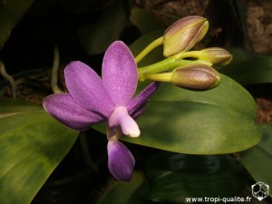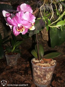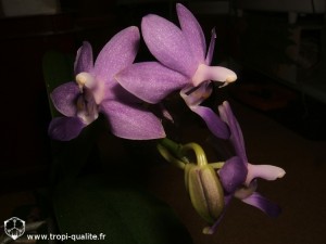Note : dans les classifications récentes, le genre Doritis est relégué au rang de synonyme du genre Phalaenopsis. Les hybrides Doritaenopsis (Dtps) ne sont donc plus vraiment considérés comme des hybrides intergénériques (entre les genres Doritis et Phalaenopsis) puisque Phalaenopsis = Doritis. Du coup ces hybrides Dtps sont en fait des hybrides de Phalaenopsis et le nom Dtps n’est plus vraiment valide, même si on le trouve encore largement dans la littérature et sur internet. Bref, voici la Belle en fleur 😉 :