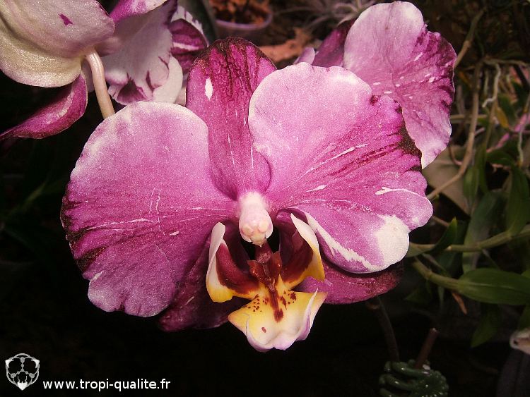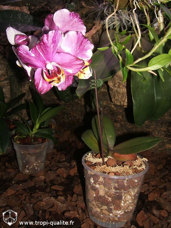 C'est un hybride intergénérique puisqu'il répond au nom de Doritaenopsis (ou Dtps en abrégé. Rapelez-vous, un hybride entre les genres Doritis et Phalaenopsis). Je remercie vivement Xavier, qui m'a beaucoup aidé à retrouver le nom exact de cet hybride extraordinaire. Les recherches furent assez longues … Ce cultivar, nommé à l'origine Dtps Chain Xen Pearl (Jw88) s'appellerait maintenant Dtps Chain Xen Pearl 'Yoshimi'.